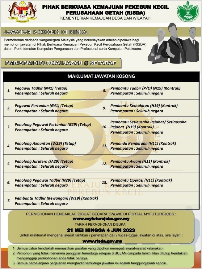 IKALN PENUH JAWATAN KOSONG PIHAK BERKUASA KEMAJUAN PEKEBUN KECIL PERUSAHAAN GETAH (RISDA) SELURUH NEGARA TAHUN 2023